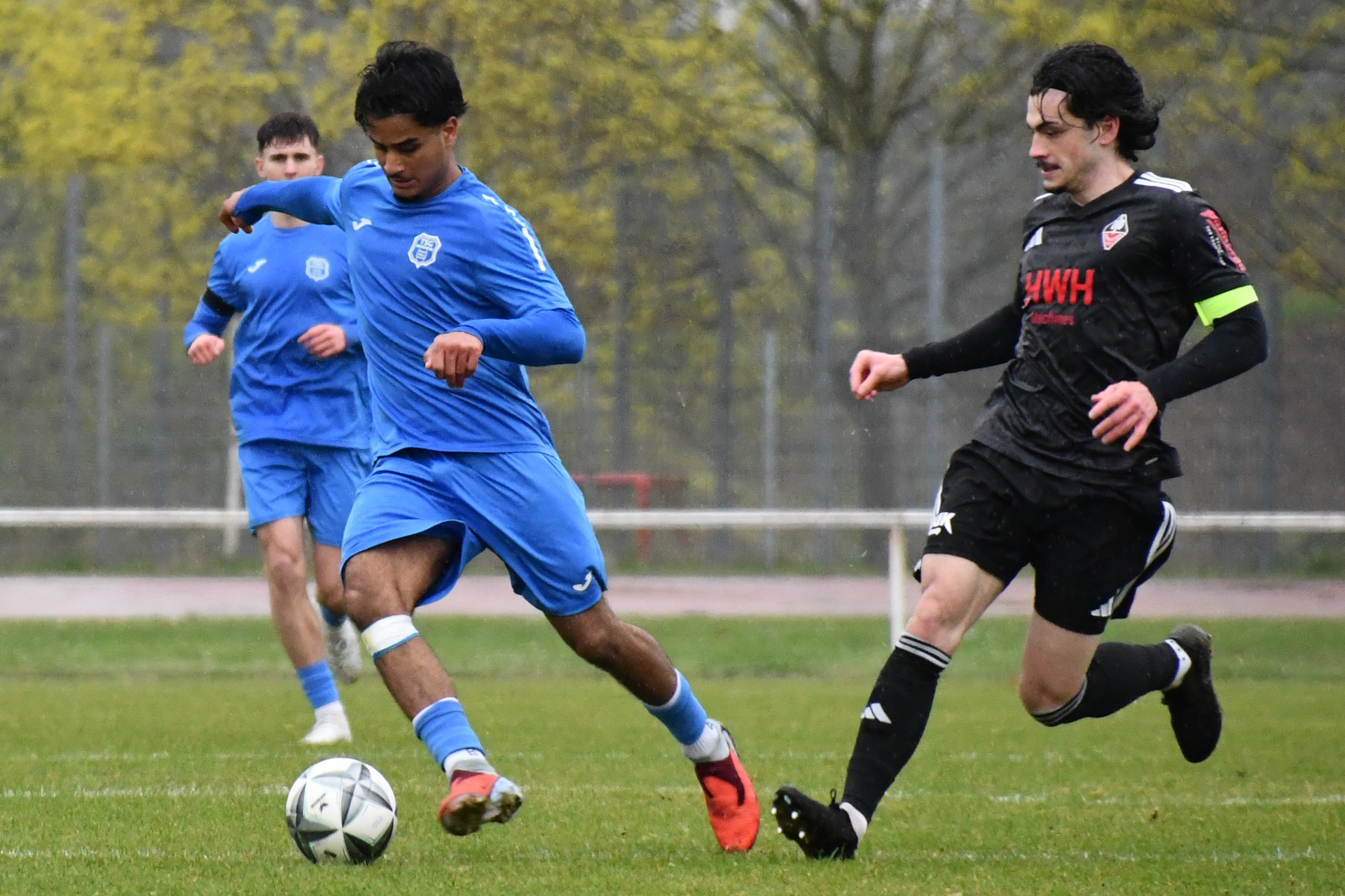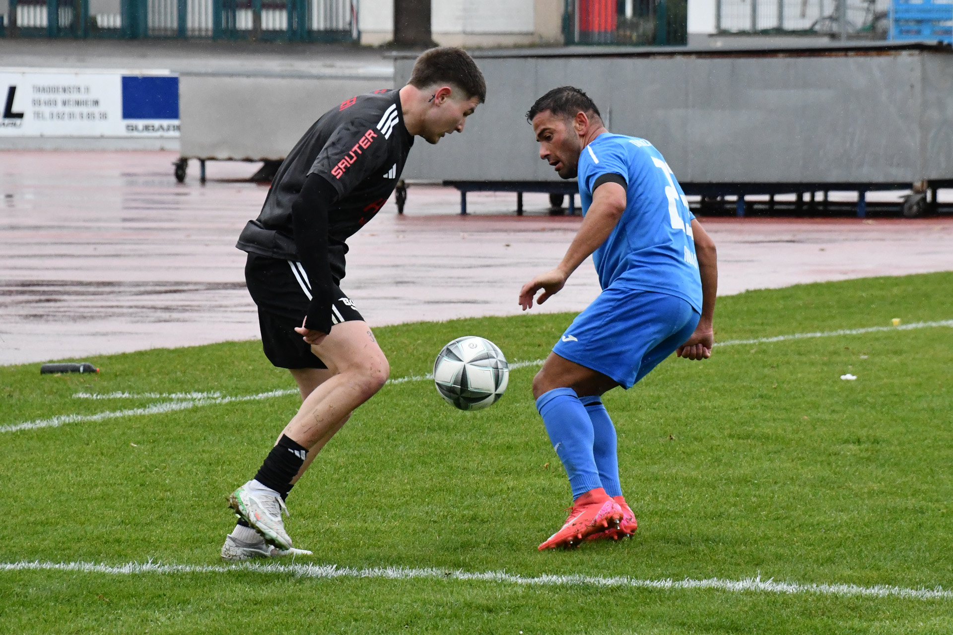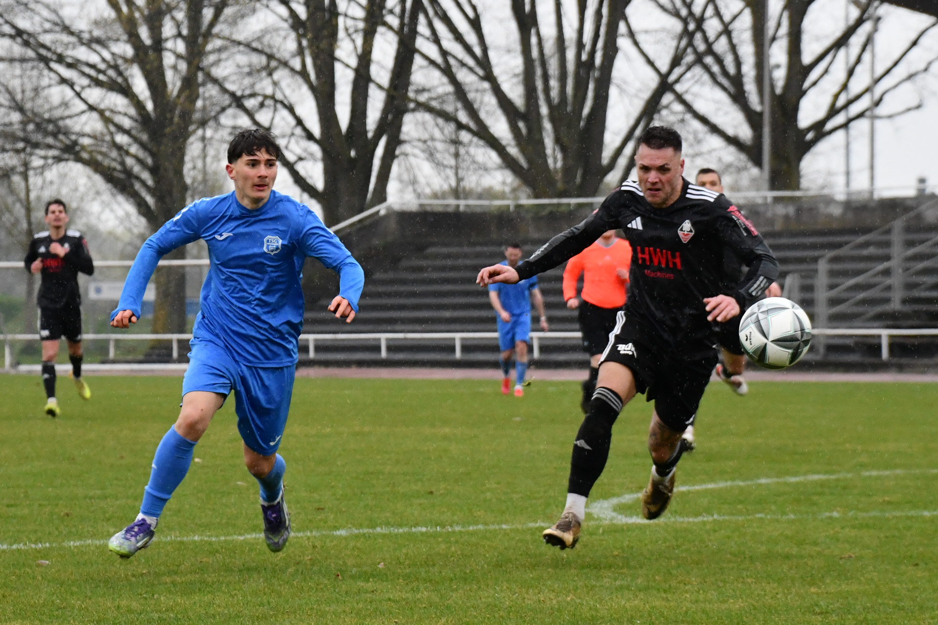 Eppingen lief das TSG-Team hoch an, die Weinheimer, die auf ihren Gelb-Rot gesperrten Kapitän Georgios Roumeliotis verzichten mussten, kamen kaum kontrolliert aus der eigenen Hälfte. Nach einem Eppinger Ballverlust auf dem rutschigen Rasen bot sich der TSG dennoch eine Konterchance, doch den von Jermain Schranz und Kühne bestens vorbereiteten Gegenstoß setzte Milad Hussaini in der 21. Minute an den Pfosten. Im fast direkten Gegenzug wäre Etienne Imsirovic, der am Samstag neben dem Trauerflor auch die Kapitänsbinde trug, fast für das 0:2 verantwortlich gewesen. Doch seinen Ballverlust an der Strafraum grenze setzte Tolga Ulusoy neben das Weinheimer Tor. Die Eppinger ließen Weinheim trotzdem kaum Raum und eroberten die Bälle oft schon in der gegnerischen Hälfte. Das 0:2 resultierte aber aus einem Konter, den erneut Tomic nach starker Vorarbeit über rechts in der 28. Minute verwandelte. Im direkten Anschluss holte Hofbauer seine Mannschaft zusammen, rüttelte noch einmal auf und stellte das System so um, dass auch Weinheim früher Druck erzeugen konnte. Doch nach einer Ecke griff zunächst noch TSG-Keeper Retter daneben, das vermeintliche 0:3 gab der Schiedsrichter aber wegen Eppinger Ellenbogeneinsatzes nicht. Wie es gehen kann, wenn das Umschaltspiel mal klappt, zeigte sich dann aber nur eine Minute später, als Jermain Schranz einen Pass nach Ballgewinn an der Mittellinie zum 1:2 im Eppinger Kasten unterbrachte. Eppingen blieb cool. Der starke Tomic gewann das Laufduell gegen Argirios Goulas und Noah Santiago Lorch verwertete die Hereingabe nach 37 Minuten zum 1:3.