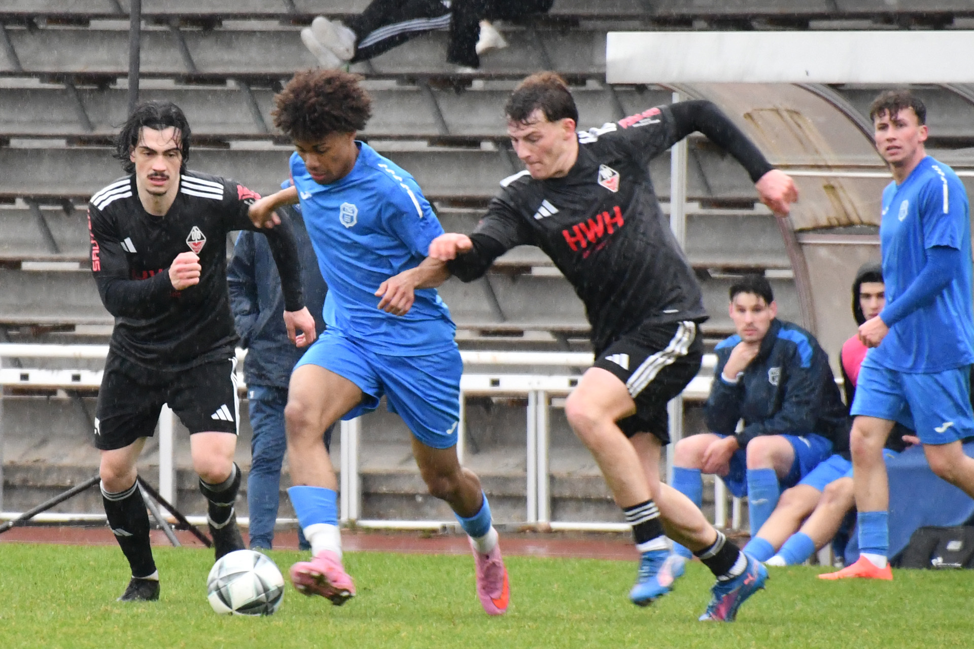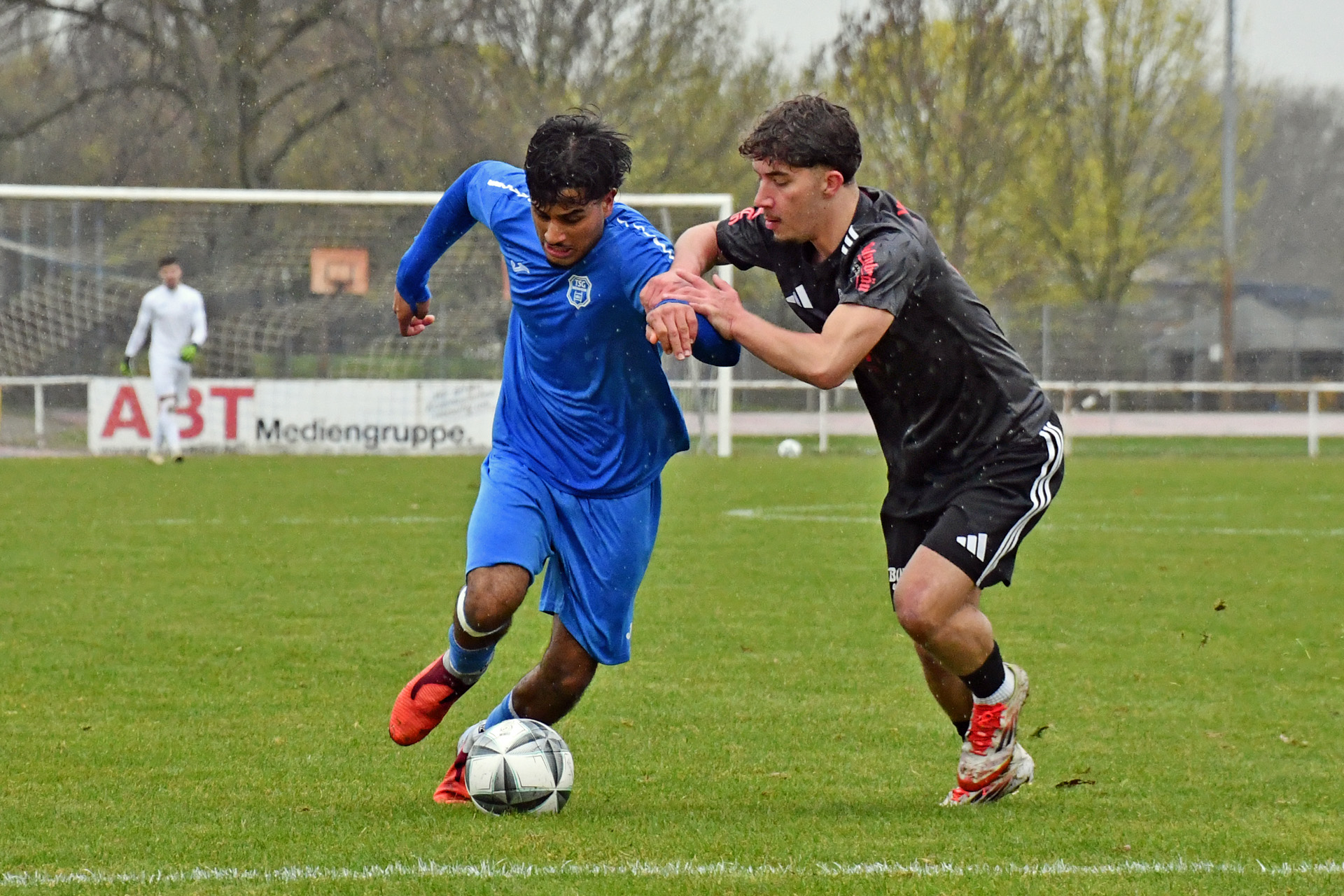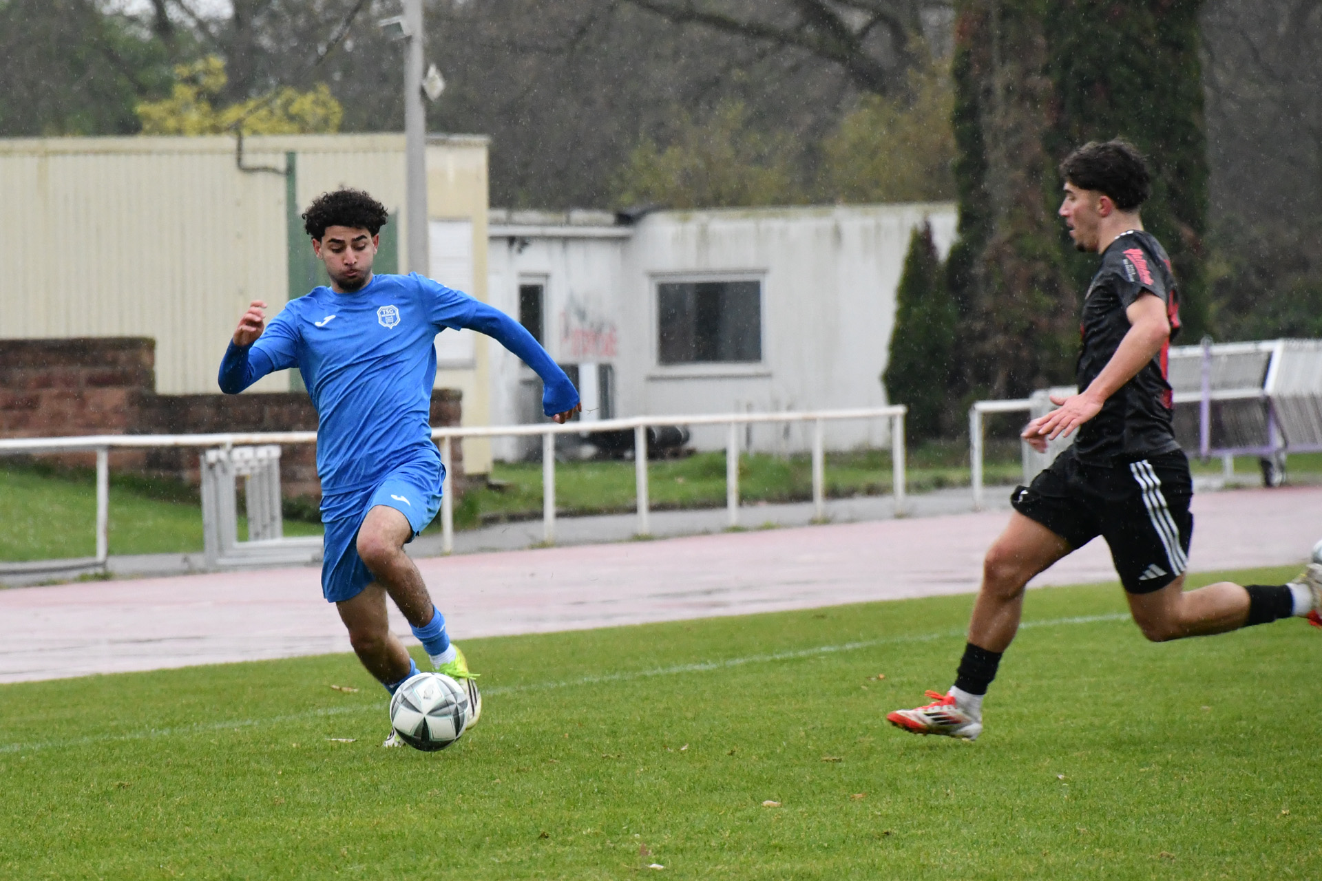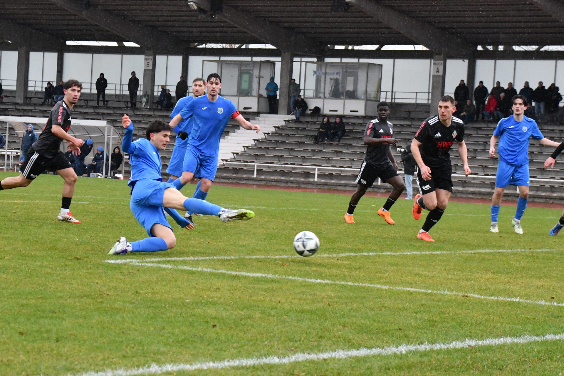 Eppingen lief das TSG-Team hoch an, die Weinheimer, die auf ihren Gelb-Rot gesperrten Kapitän Georgios Roumeliotis verzichten mussten, kamen kaum kontrolliert aus der eigenen Hälfte. Nach einem Eppinger Ballverlust auf dem rutschigen Rasen bot sich der TSG dennoch eine Konterchance, doch den von Jermain Schranz und Kühne bestens vorbereiteten Gegenstoß setzte Milad Hussaini in der 21. Minute an den Pfosten. Im fast direkten Gegenzug wäre Etienne Imsirovic, der am Samstag neben dem Trauerflor auch die Kapitänsbinde trug, fast für das 0:2 verantwortlich gewesen. Doch seinen Ballverlust an der Strafraum grenze setzte Tolga Ulusoy neben das Weinheimer Tor. Die Eppinger ließen Weinheim trotzdem kaum Raum und eroberten die Bälle oft schon in der gegnerischen Hälfte. Das 0:2 resultierte aber aus einem Konter, den erneut Tomic nach starker Vorarbeit über rechts in der 28. Minute verwandelte. Im direkten Anschluss holte Hofbauer seine Mannschaft zusammen, rüttelte noch einmal auf und stellte das System so um, dass auch Weinheim früher Druck erzeugen konnte. Doch nach einer Ecke griff zunächst noch TSG-Keeper Retter daneben, das vermeintliche 0:3 gab der Schiedsrichter aber wegen Eppinger Ellenbogeneinsatzes nicht. Wie es gehen kann, wenn das Umschaltspiel mal klappt, zeigte sich dann aber nur eine Minute später, als Jermain Schranz einen Pass nach Ballgewinn an der Mittellinie zum 1:2 im Eppinger Kasten unterbrachte. Eppingen blieb cool. Der starke Tomic gewann das Laufduell gegen Argirios Goulas und Noah Santiago Lorch verwertete die Hereingabe nach 37 Minuten zum 1:3.